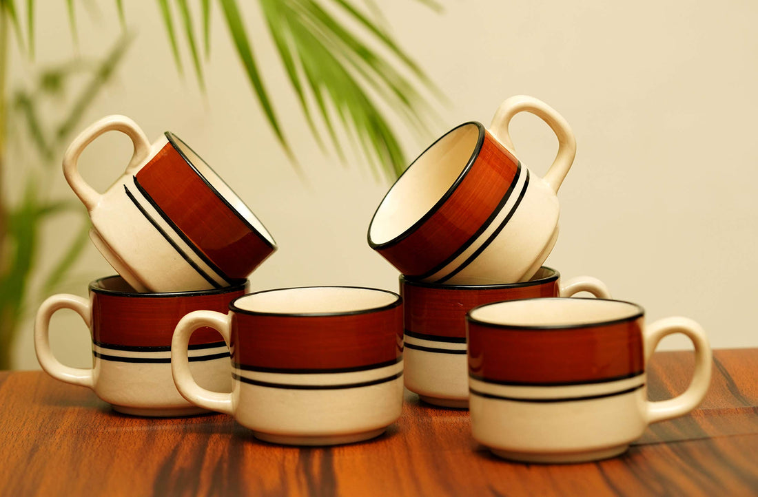 Freakway Hand-Painted Studio Pottery Off White and Brown Hand Painted Ceramic Coffee Mugs Set of 6/ Tea Cups