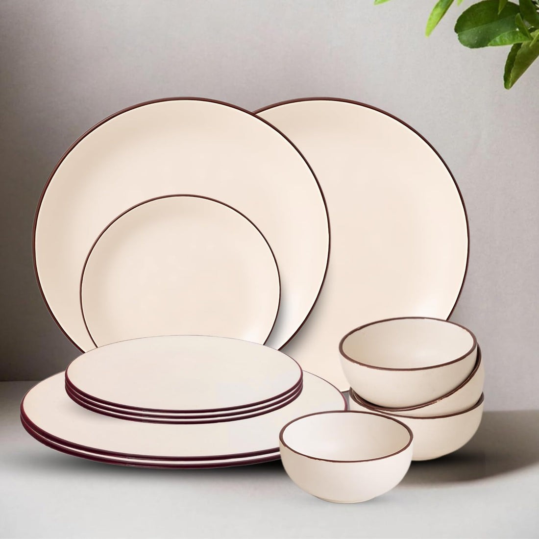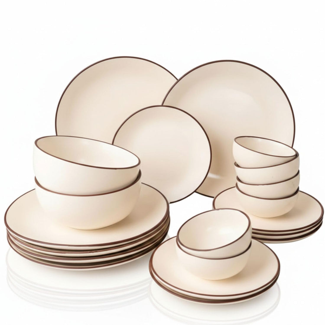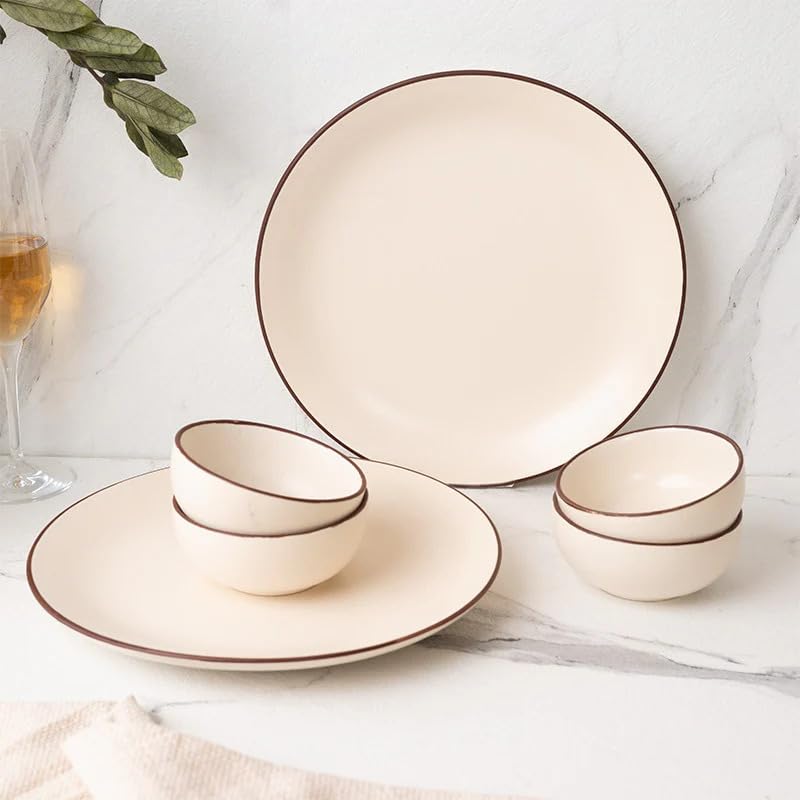 Freakway Hand Painted Ceramic Dinner Set, 20 Pieces, Ivory White with Brown Rim, Stoneware, Microwave & Dishwasher Safe