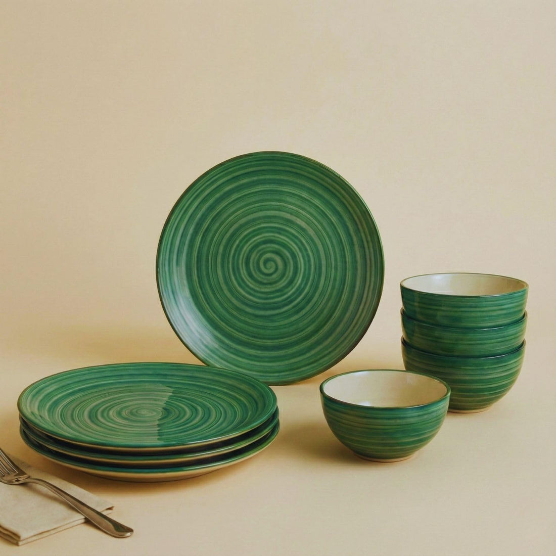 Freakway Hand-Painted 'Sea Swirls' Dinner Set Ceramic Stoneware Dinner Set of 8 Pieces | 4 Ceramic Dinner Plate and 4 Bowl/katori | Bone Ash Free | Microwave and Dishwasher Safe - Green
