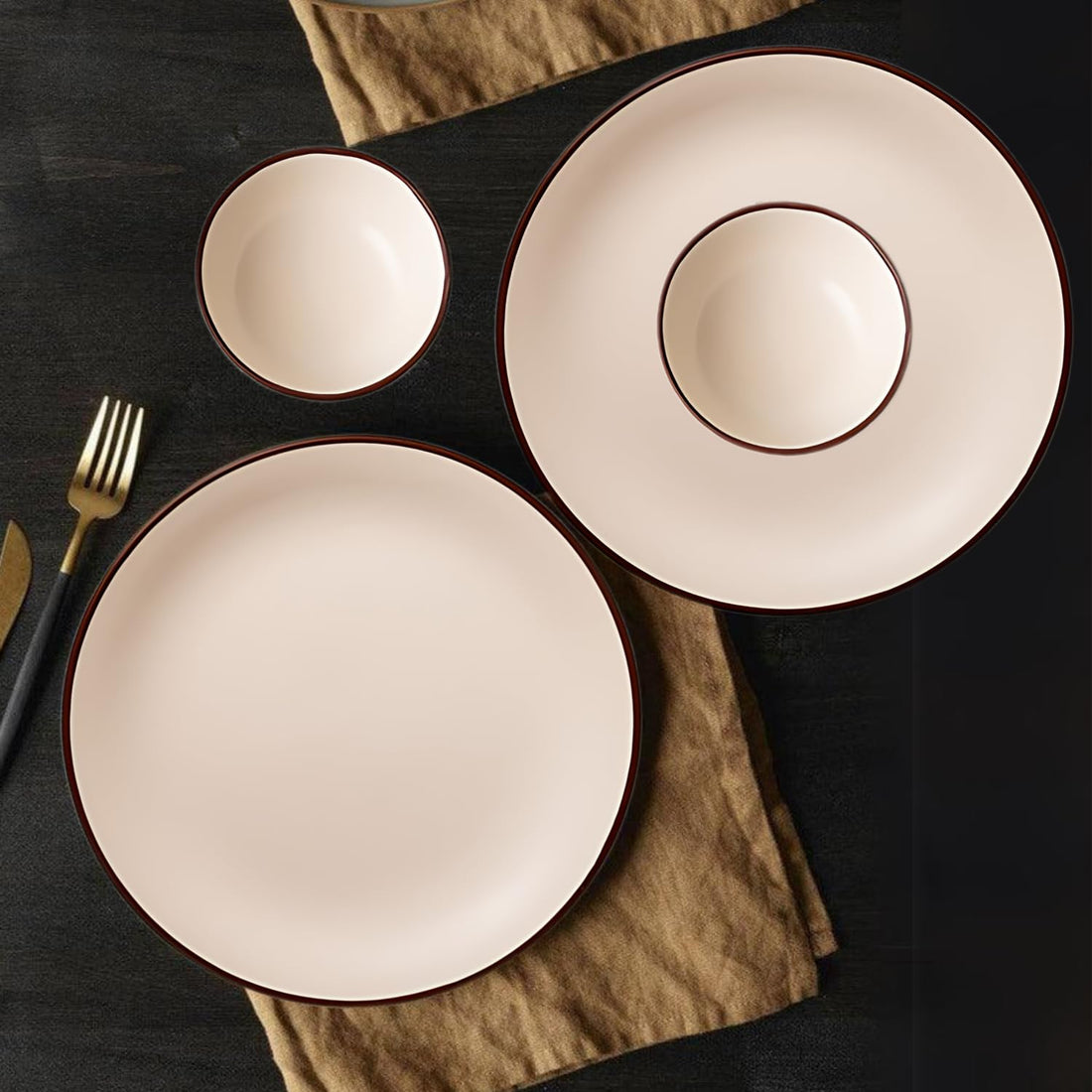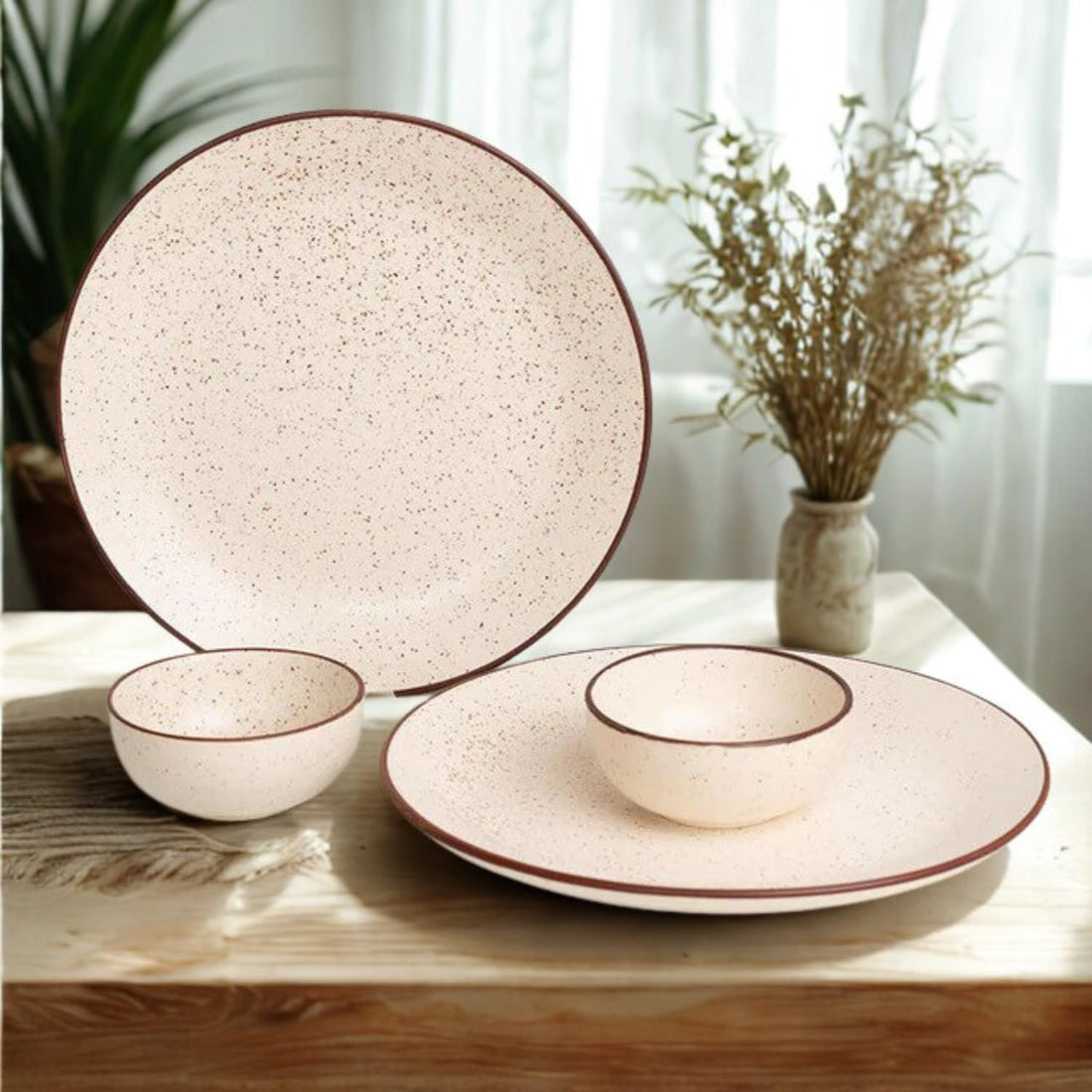 Freakway Rustic Speckled Ceramic Dinner Set – 4 Pc (2 Plates, 2 Bowls) – Beige with Brown Rim