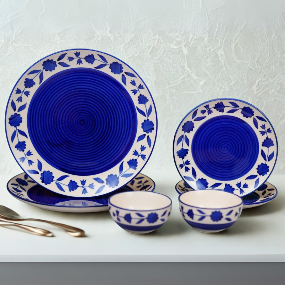 Freakway Floral Hand-Painted Ceramic Dinner Set of 6 Pcs | (10 Inch) 2 Stoneware Dinner Plates, 2 Side Plates (7 Inch) with 2 Serving Bowls (180 Ml) | Microwave & Dishwasher Safe - Royal Blue