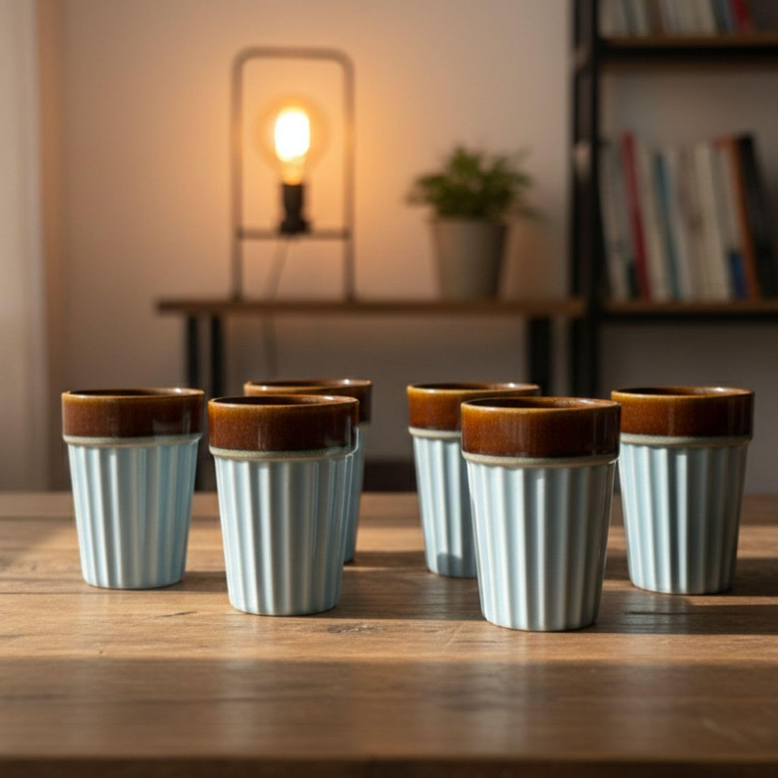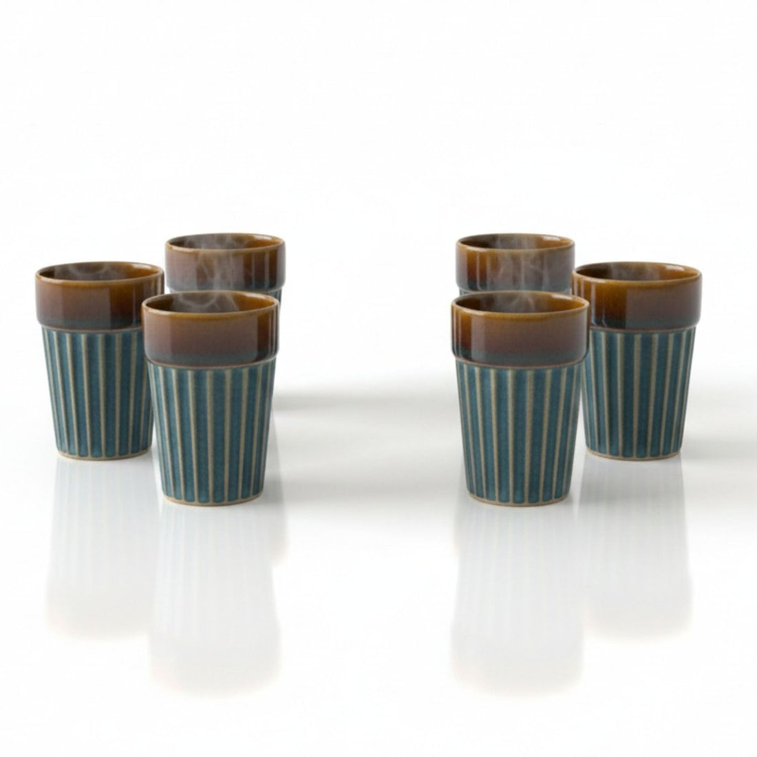 Freakway Highline Series Hand-Glazed Ceramic Chai Glasses, Modern Ribbed Stoneware Cups for Authentic Tea Experience, Set of 6