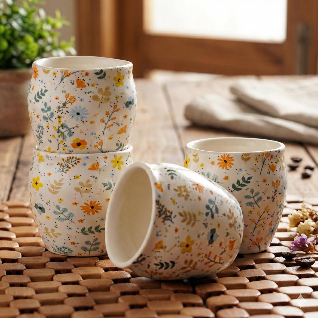 Freakway Hand-Painted Ceramic Sun-Floral Art kulhad Set of 4 Cups |kullad Tea Set | kulhad chai Cups | Hand Painted kulhad Coffee Mug, Multicolor((Microwave & Dishwasher Safe)