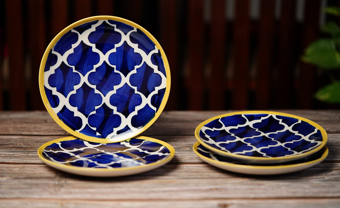 Freakway Hand-Painted Stoneware Moroccan Premium Ceramic 7-inch Quarter/Small Plate Set of 4 Pcs | Bone Ash Free | Microwave and Dishwasher Safe - Blue