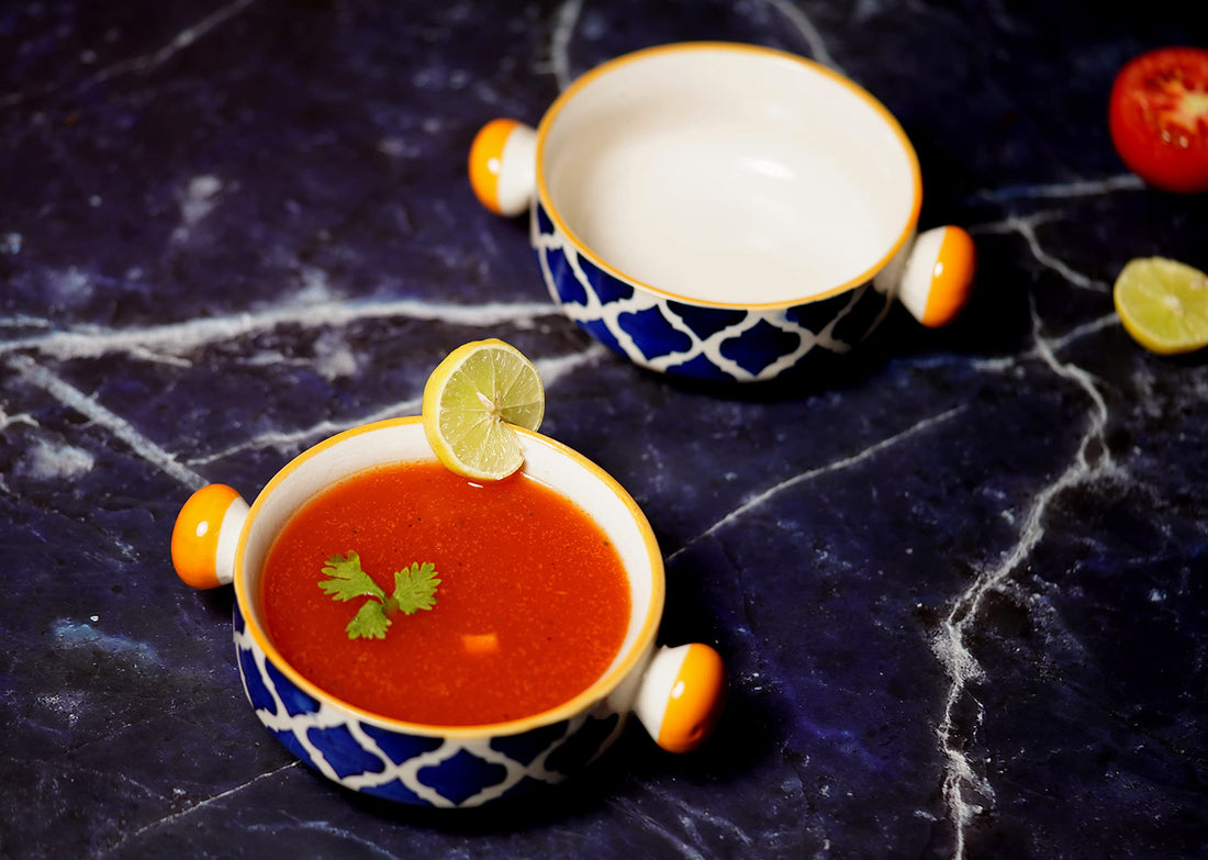 Freakway Hand-Painted Two Ceramic Yellow and Blue Floral/Moroccan Soup/Dinning/Serving/Multipurpose Bowl with Handle Capacity - 300 ml (New)