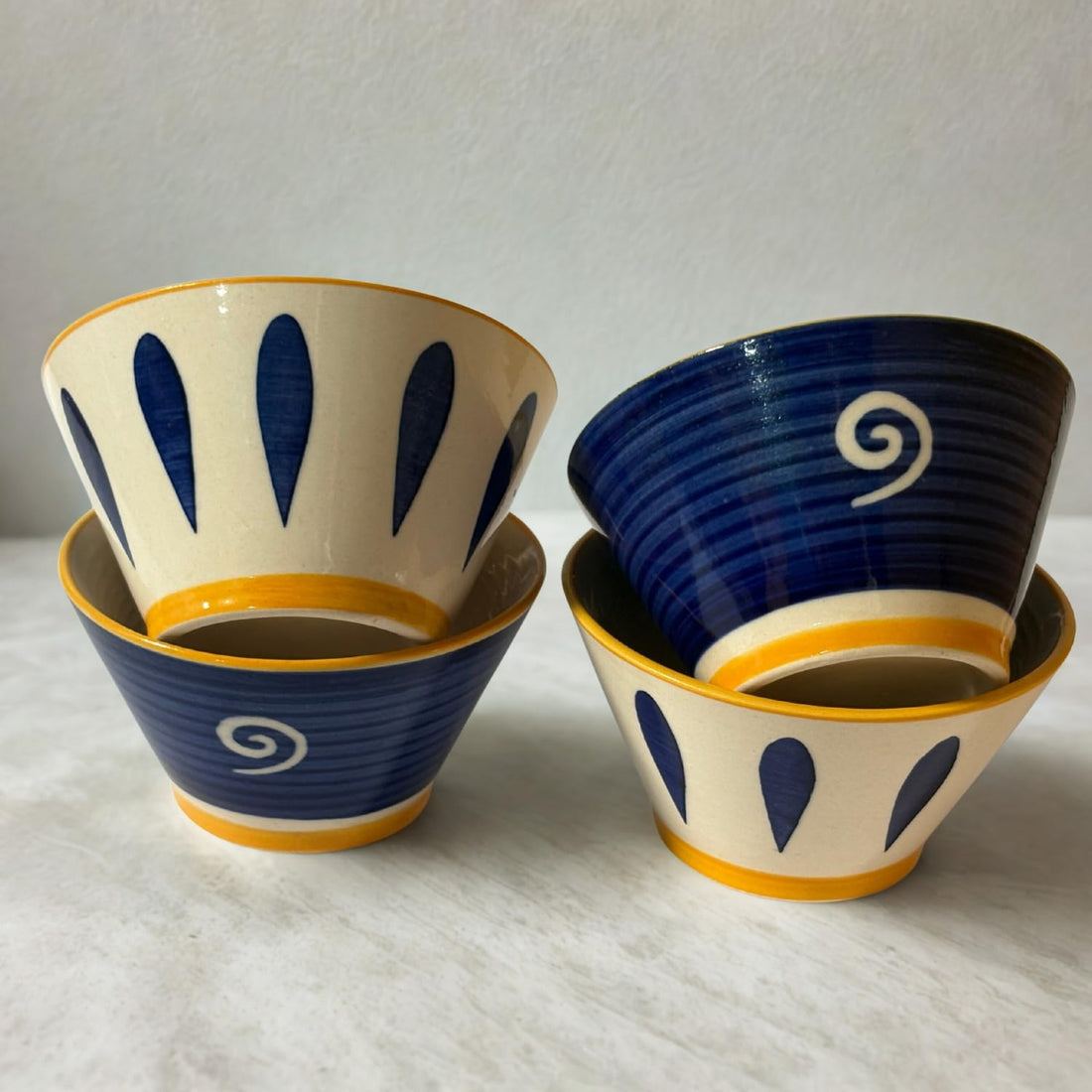 Freakway Handcrafted Ceramic Bowls Set of 4 – Spiral Design, Deep Blue with Yellow Rim – Microwave & Dishwasher Safe-200 ML