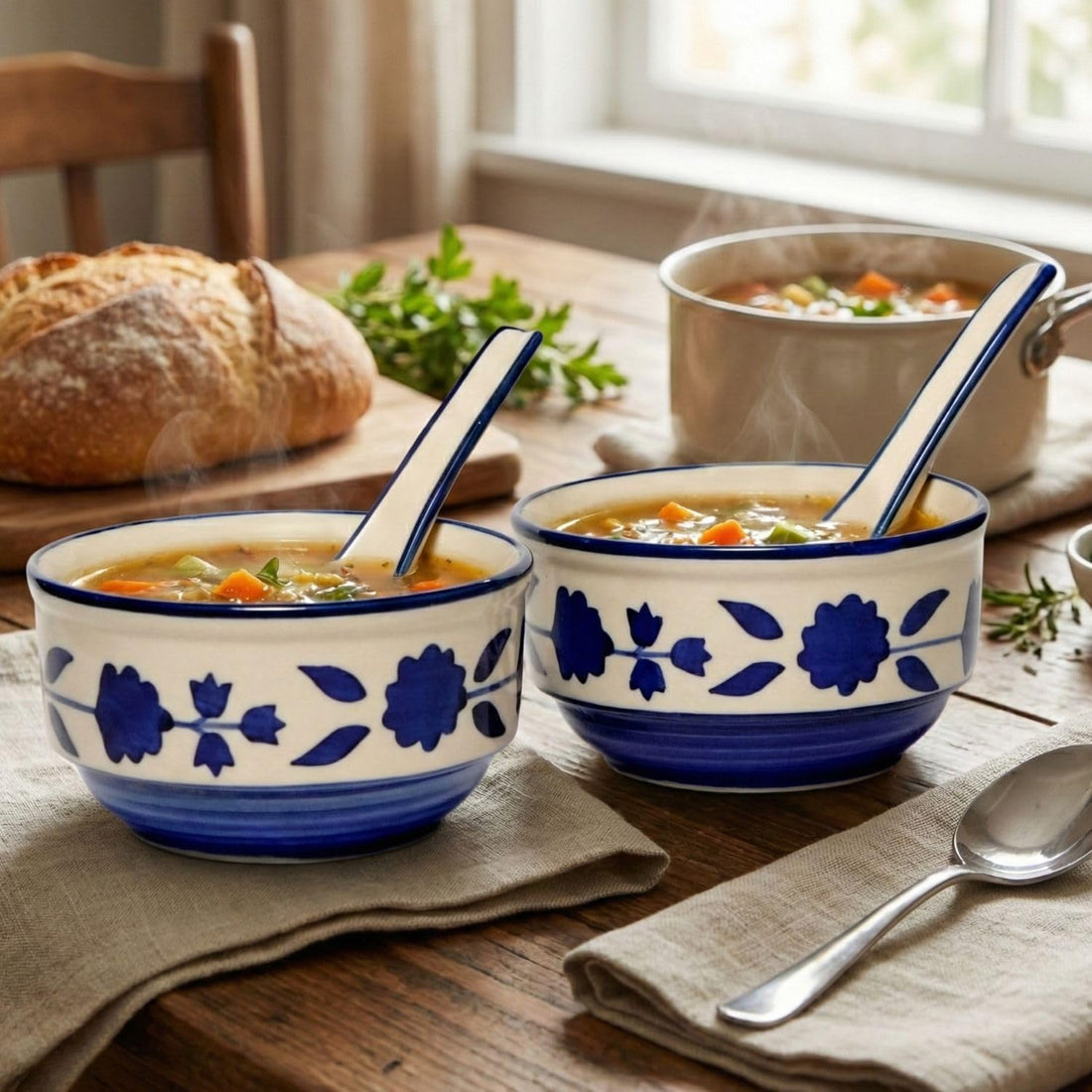 Freakway Handpainted Royal Blue Floral and Leaf-Stripe Pattern Ceramic Soup Bowls with Matching Spoons - (Set of 2, 350 ML, Dishwasher & Microwave Safe)