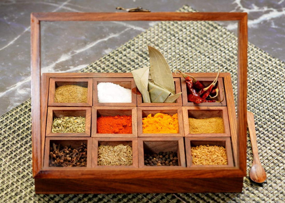 Freakway Spice Box Masala Box/Dabba/Hand Crafted With spoon In Sheesham Wood for Kitchen with 9 cotainer