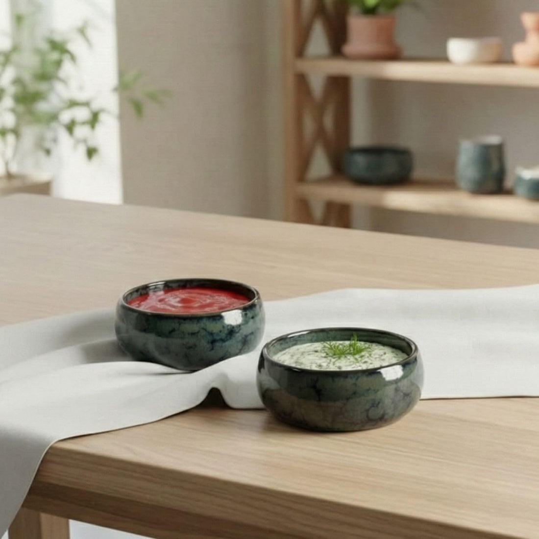 Freakway® 150 ml Ceramic Dip Bowls Set of 2 – Handcrafted Dual Tone Green & Beige | Small Serving Bowls for Snacks, Dips & Desserts