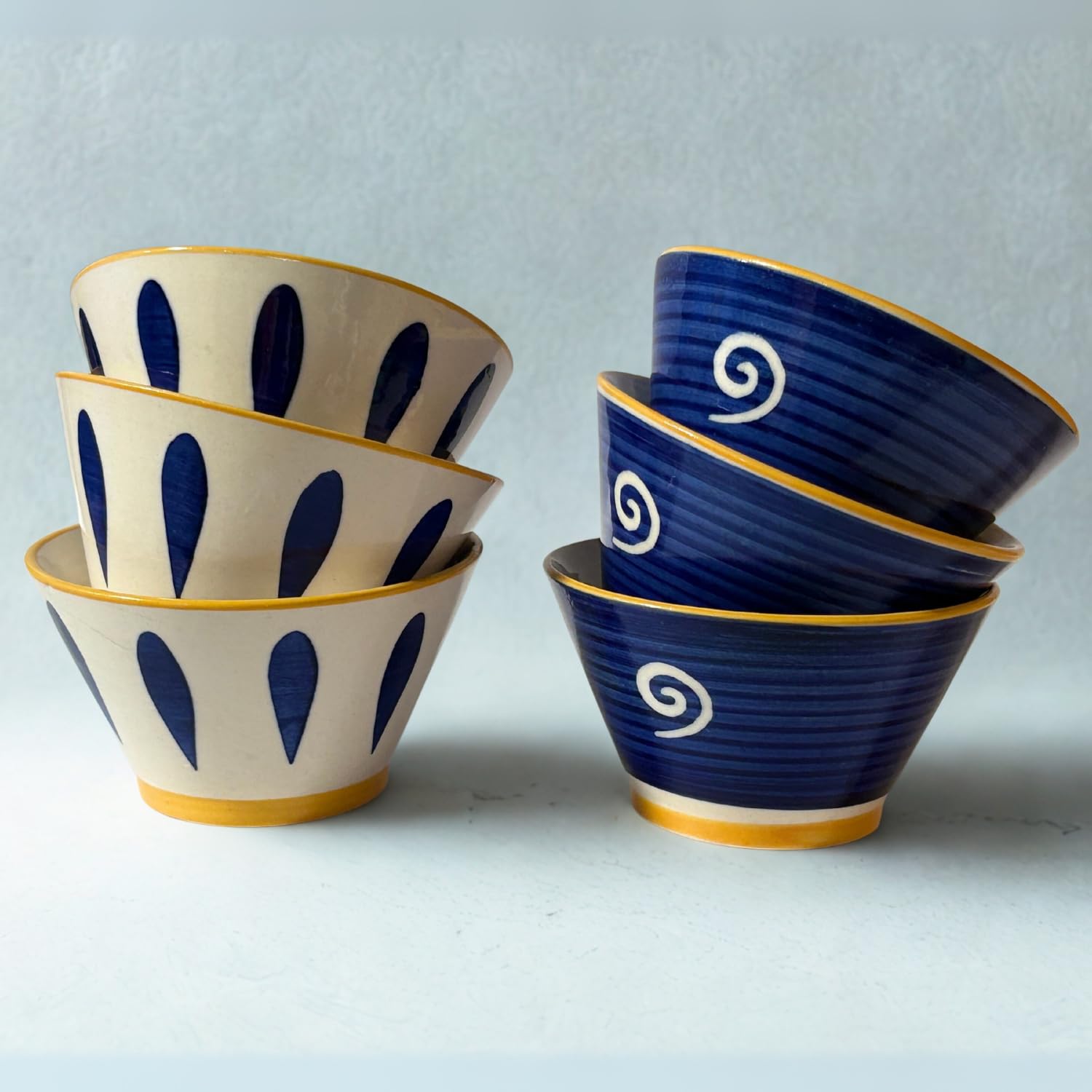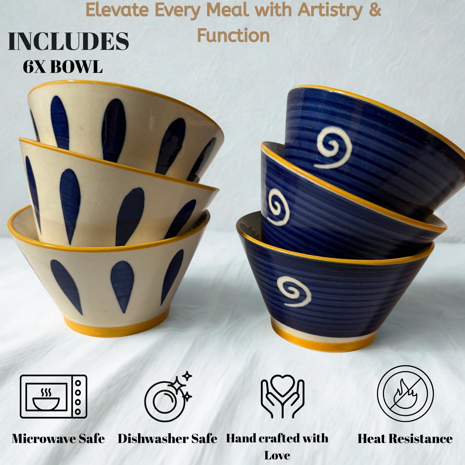 - ✅ High Handcrafted Ceramic Bowls Set (Set of 6) – Beautifully designed bowls featuring a unique hand-painted blue teardrop pattern with a vibrant yellow rim, perfect for elevating your dining experience.
