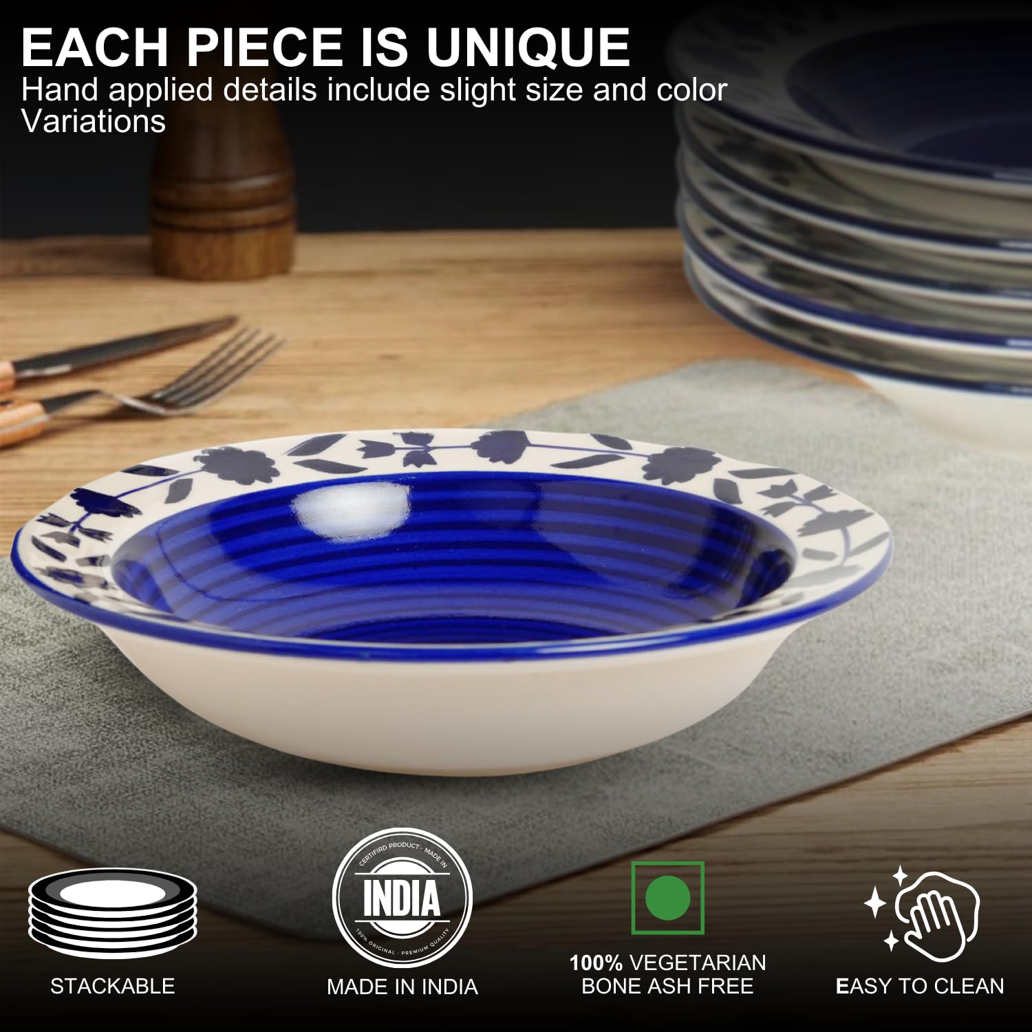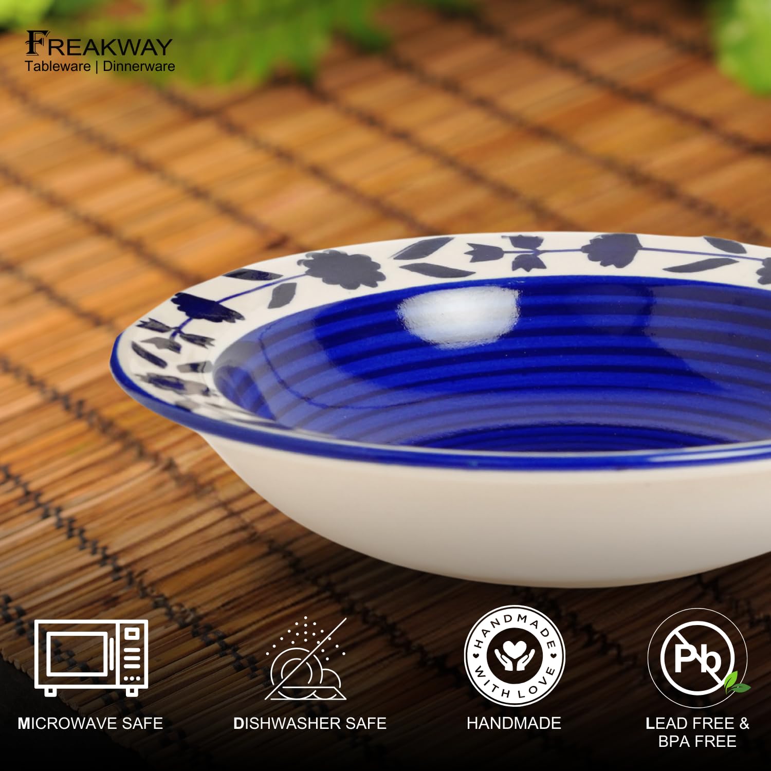 Freakway Hand-Painted Floral Blue Ceramic Pasta Plate | Snack Plate | Soup Plate Set of 2-7 Inch Microwave Oven Safe