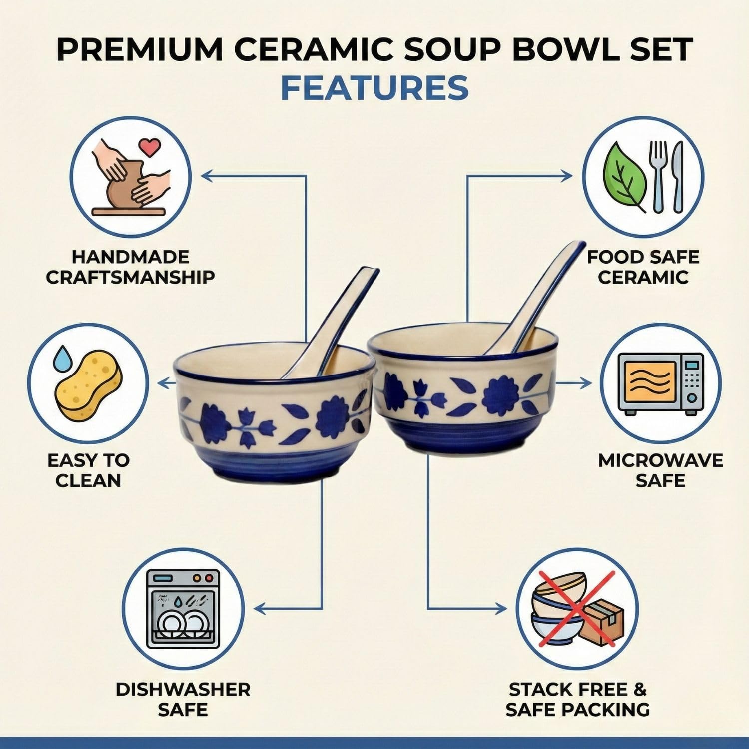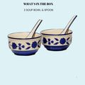 Freakway Handpainted Royal Blue Floral and Leaf-Stripe Pattern Ceramic Soup Bowls with Matching Spoons - (Set of 2, 350 ML, Dishwasher & Microwave Safe)