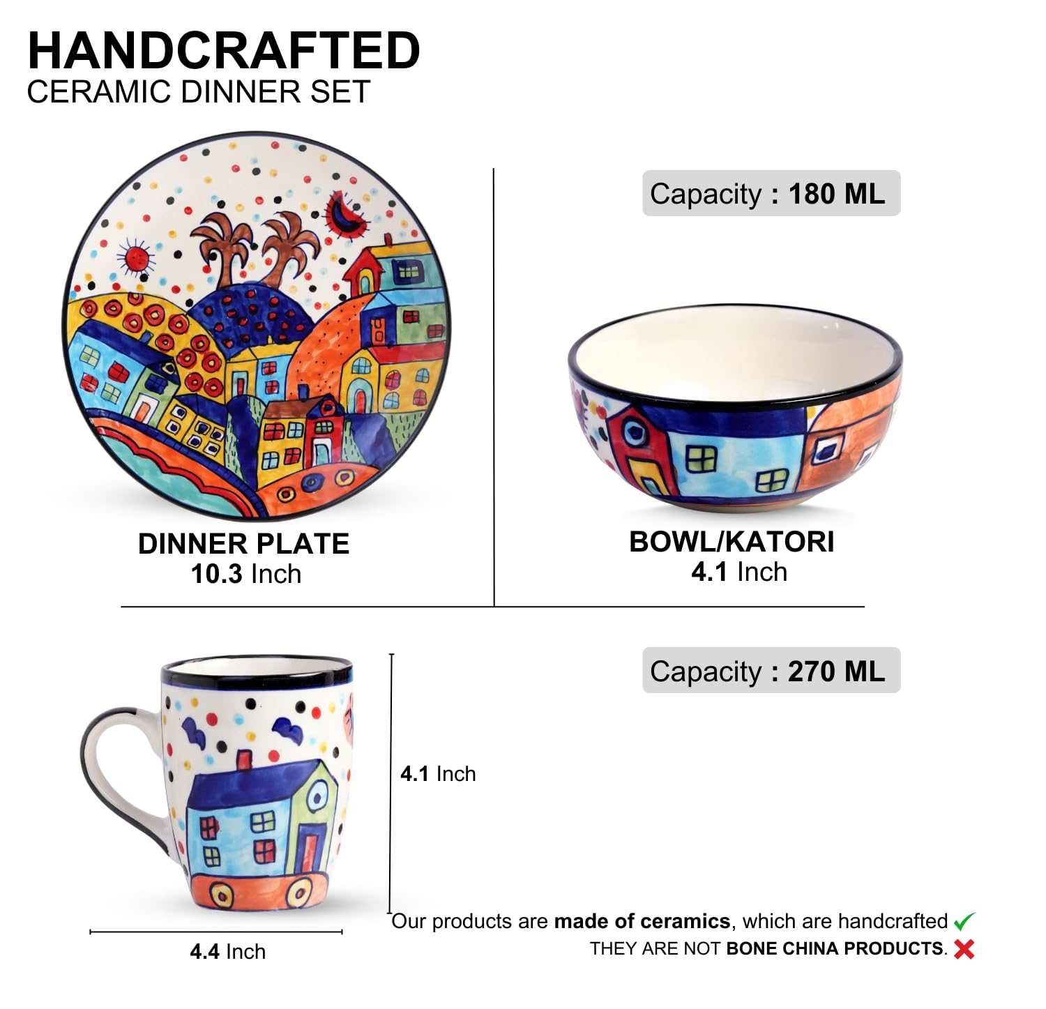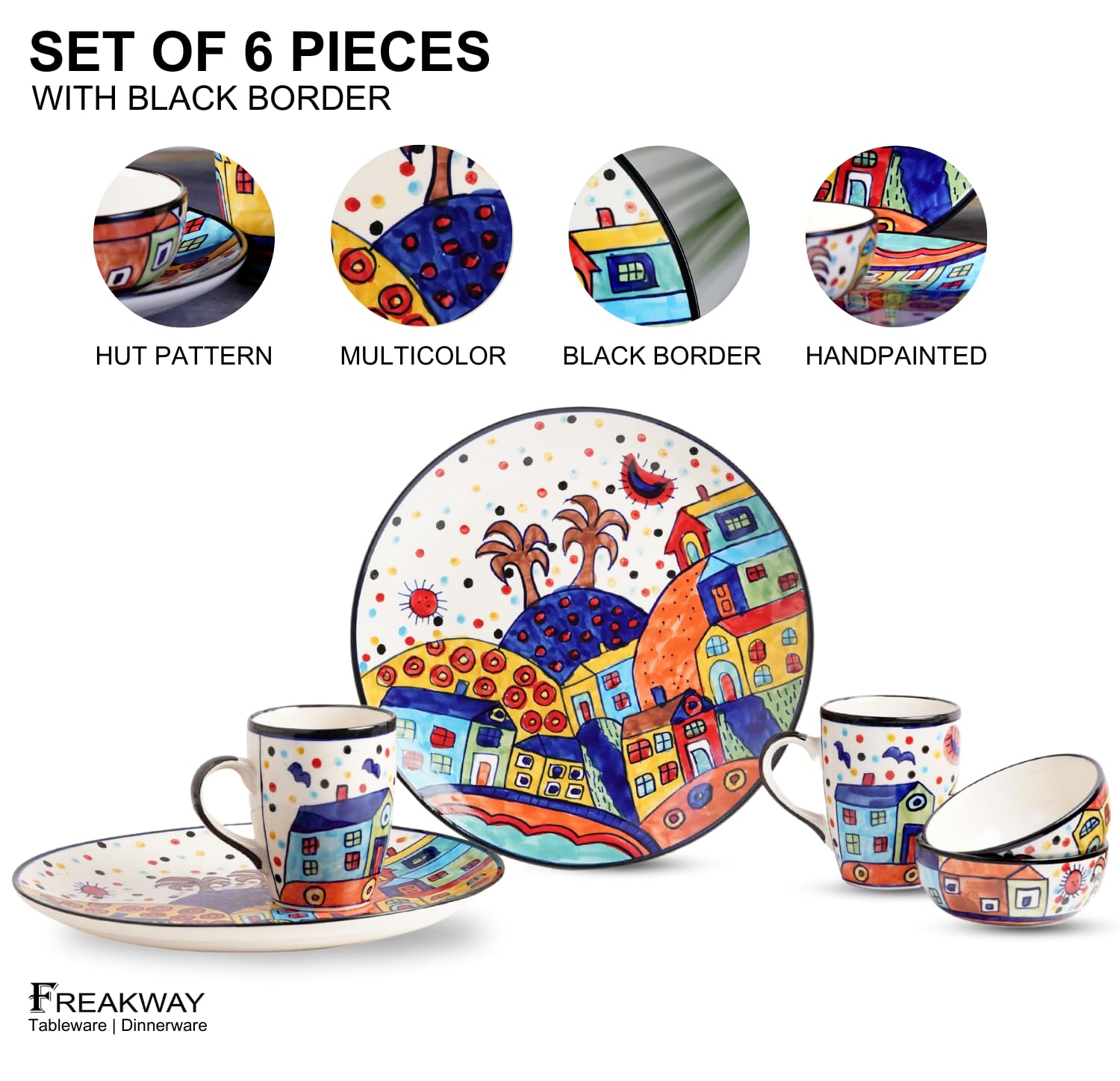 Freakway Hut Family Hand-Painted Ceramic Plates Thali 2 Dinner Plates in 10 Inch with 2 Katoris & 2 Coffee Mug (6 Pieces, Dishwasher & Microwave Safe) -
