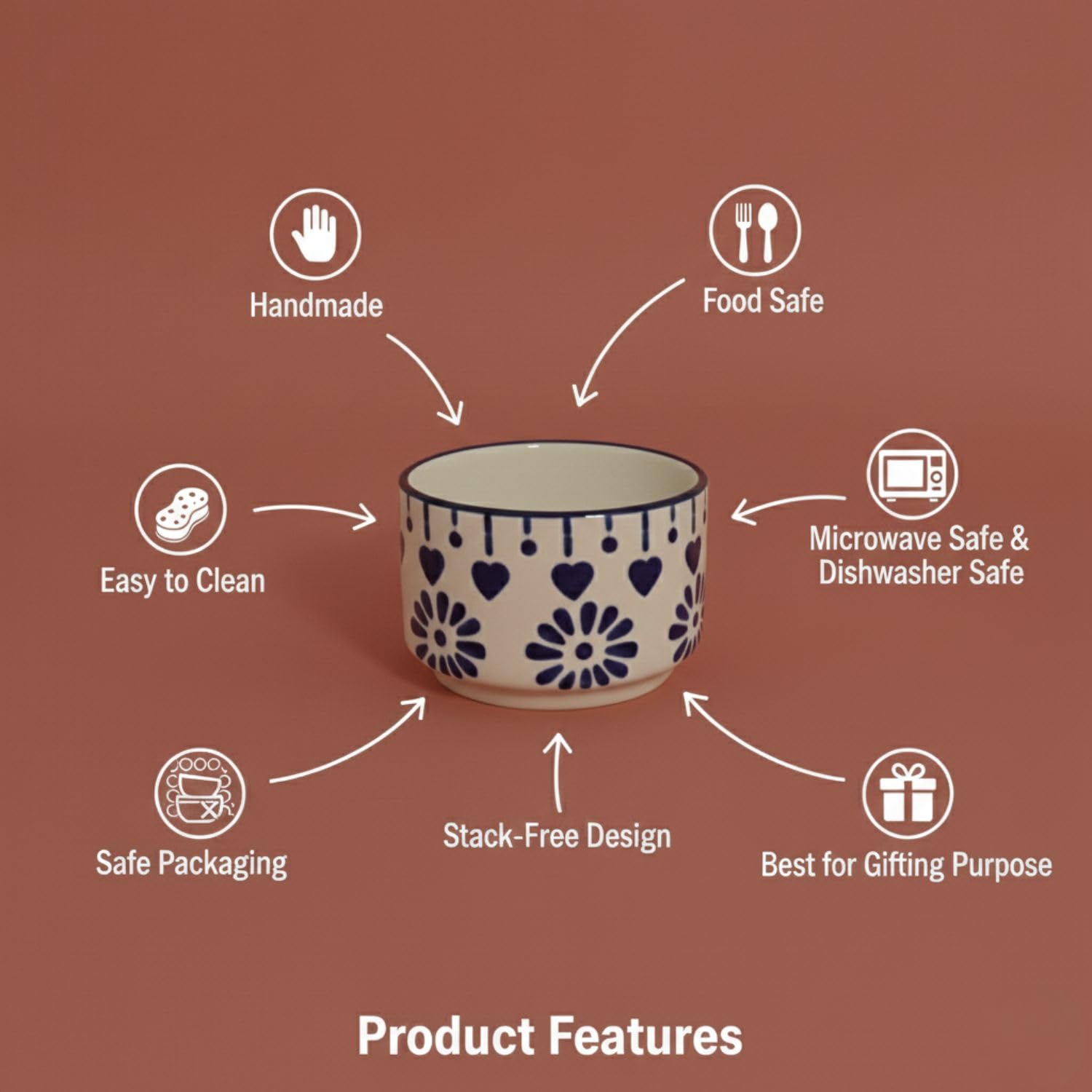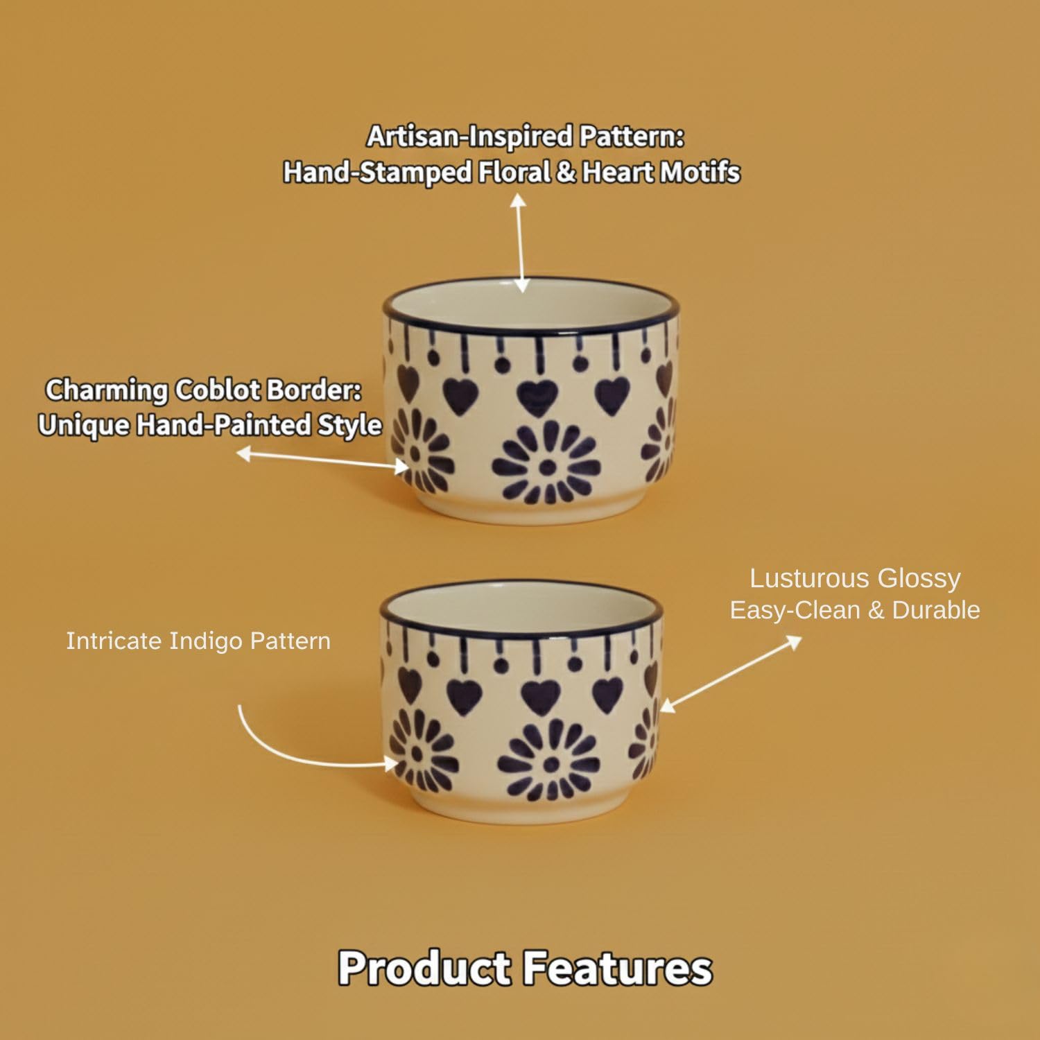 - ELEGANT DESIGN: Beautiful Indigo Blossom ceramic dipping bowls featuring decorative heart and flower patterns in classic blue and white, perfect for serving sauces, dips, or condiments