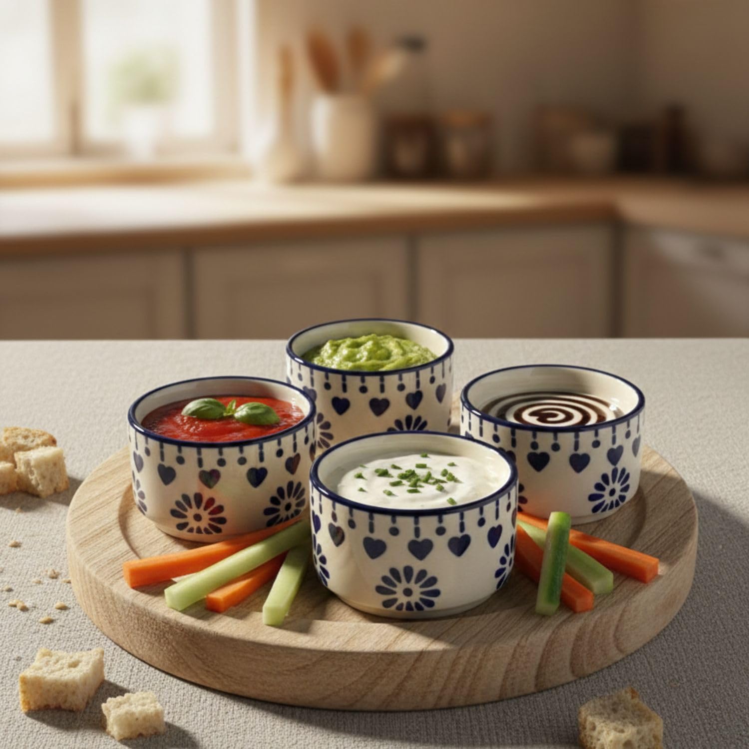 Freakway Indigo Blossom 4-Piece Ceramic Dipping Bowl Set, Blue and White, Microwave & Dishwasher Safe, Decorative Heart and Flower Pattern
